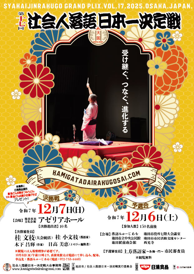 2025年12月6日&7日に開催される「第17回社会人落語日本一決定戦」の応募用紙付き フリーペーパーです。大会統括・桂文枝師匠のコメントも掲載されています。 原本ご希望の際は事務局までご連絡ください。 ★ダウンロードする 原本を希望する