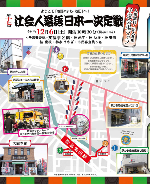 平成21年、池田市市制70周年事業として、桂文枝師匠大会統括のもと始まりました。年に一度、全国より社会人落語家が集結し、日本一を競います。