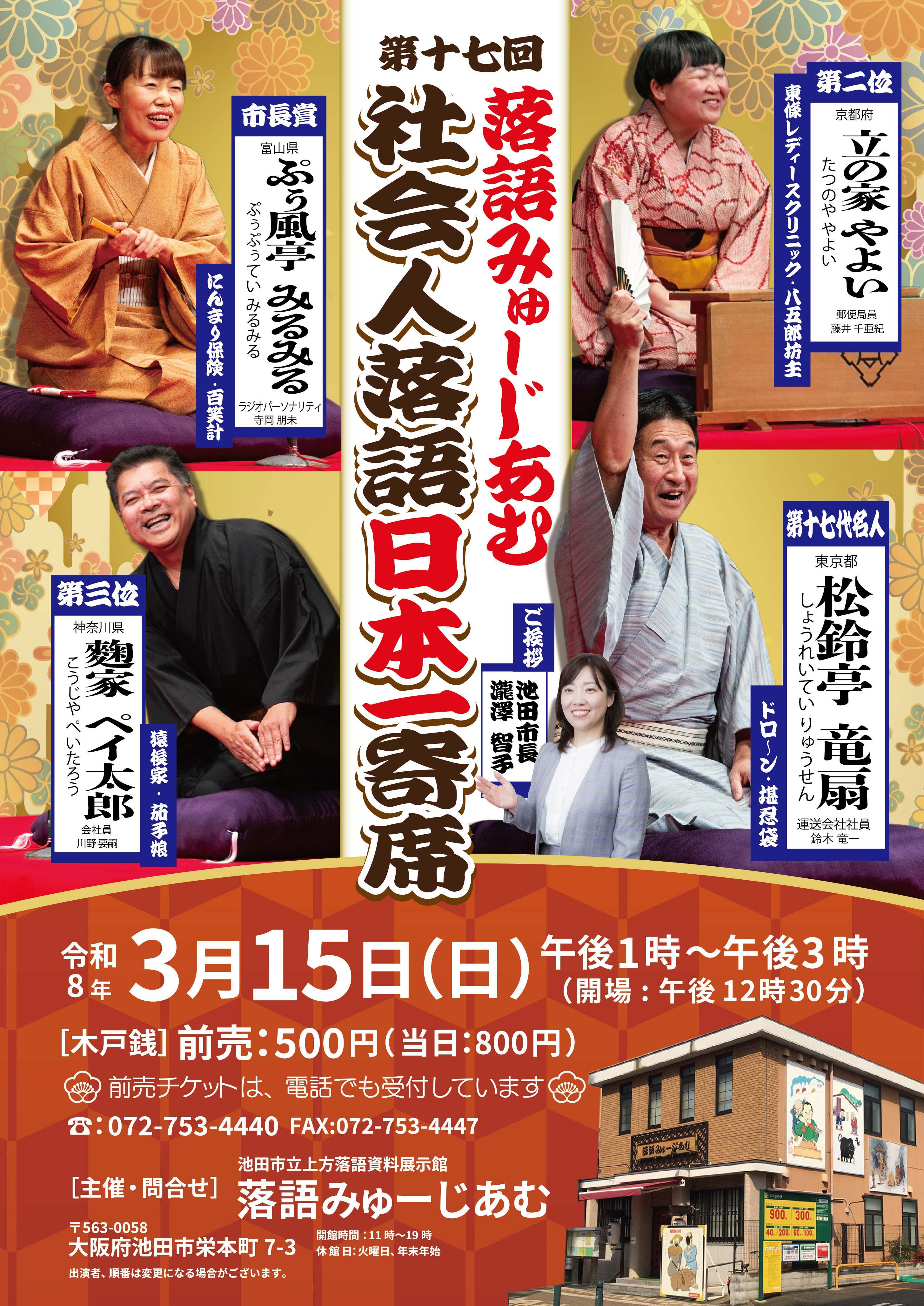 平成21年、池田市市制70周年事業として、桂文枝師匠大会統括のもと始まりました。年に一度、全国より社会人落語家が集結し、日本一を競います。